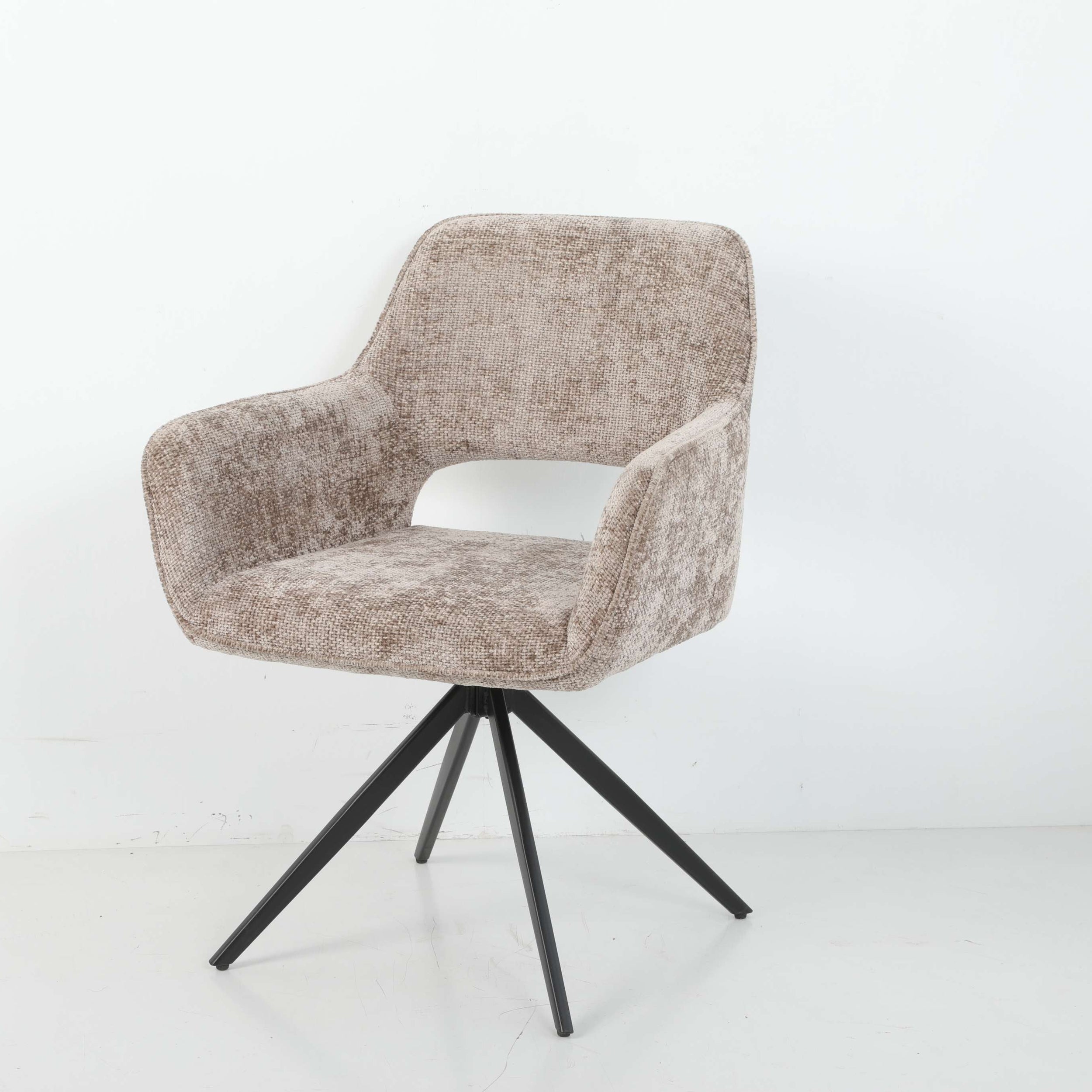 De Julia eetkamerstoel van Van Soest Living straalt rust en verfijning uit dankzij haar zachte, gemêleerde bekleding en open vormgeving. De luxe stof voelt aangenaam aan en geeft de stoel een warme, eigentijdse uitstraling. Het subtiele open rugdetail zorgt voor een luchtig silhouet en extra comfort tijdens het zitten.